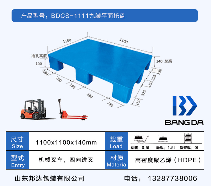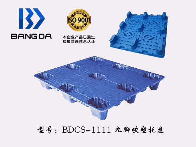 九腳塑料托盤,即根據托盤的外形來看,這種類型的托盤底部是九腳,因此得名九腳塑料托盤。一般這種裝載比較輕,不適合上架裝載貨物,也不適合轉運重物。九腿托盤一般用作倉庫的輕貨墊板,叉車用于翻輕貨。這樣的盤面形狀有:平面和網格之分。