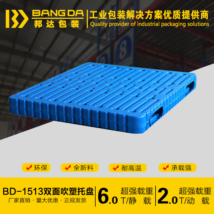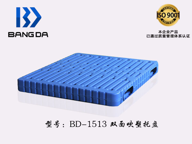 BD-1513雙面塑料托盤尺寸為1500*1300*150(mm)采用國內最先進的吹塑技術,原材料采用的是HDPE一種結晶度高,非極性的熱塑性樹脂;邦達的雙面塑料托盤承載強,耐高溫且環保;山東邦達包裝有