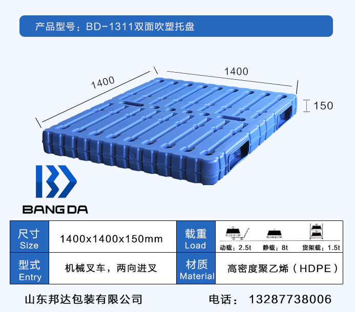 BD-1414雙面塑料托盤尺寸為1400*1400*150(mm)采用國內最先進的吹塑技術,原材料采用的是HDPE一種結晶度高,非極性的熱塑性樹脂;邦達的雙面塑料托盤承載強,耐高溫且環保;山東邦達包裝有