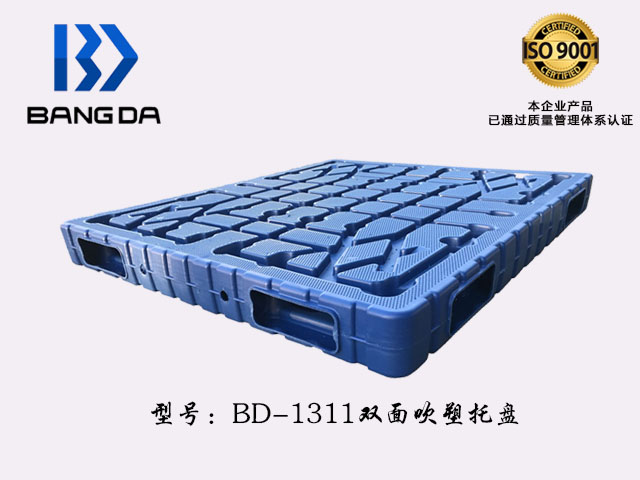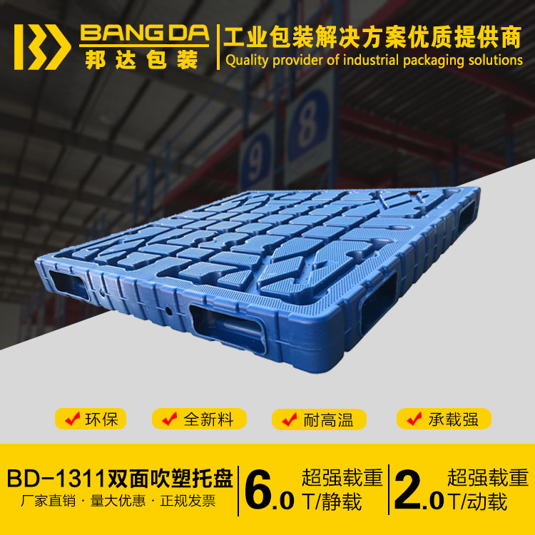 BD-1311雙面塑料托盤尺寸為1300*1100*150(mm),采用國內最先進的吹塑技術,原材料采用的是HDPE一種結晶度高,非極性的熱塑性樹脂;邦達的雙面塑料托盤承載強,耐高溫且環保;山東邦達包裝有限公司承諾旗下所有的產品均此采用全新材料,廠家直銷,正規發票,量大優惠!