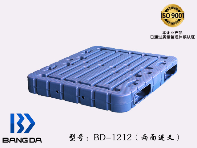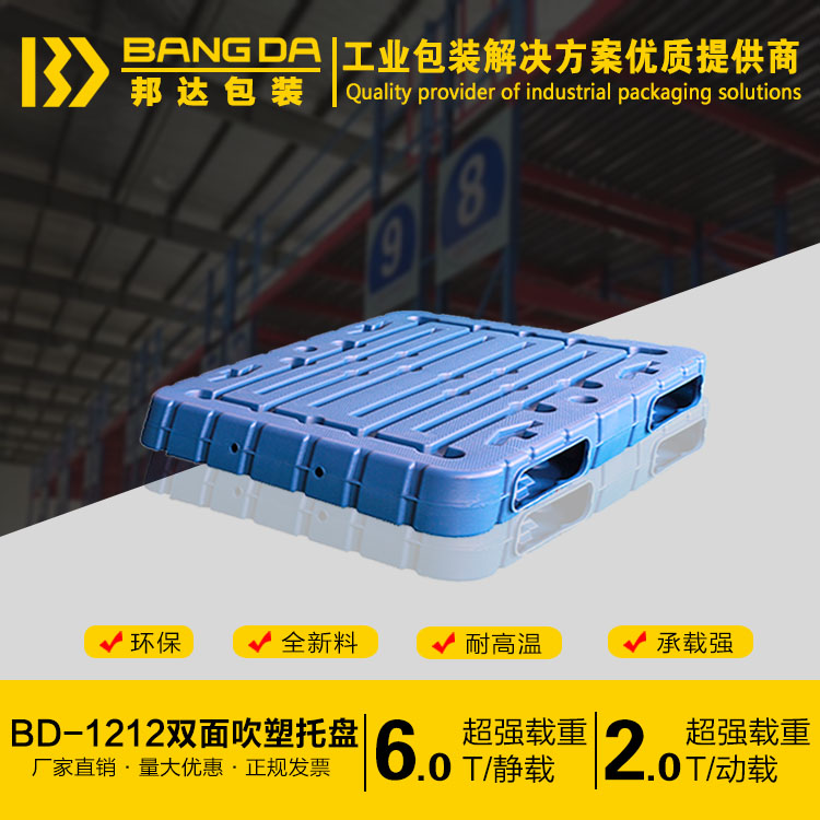 BD-1212雙面塑料吹塑托盤尺寸為1200*1200*150(mm),采用國內最先進的吹塑技術,原材料采用的是HDPE一種結晶度高,非極性的熱塑性樹脂;邦達的雙面塑料托盤承載強,耐高溫且環保;山東邦達包裝有限公司承諾旗下所有的產品均此采用全新材料,廠家直銷,正規發票,量大優惠!