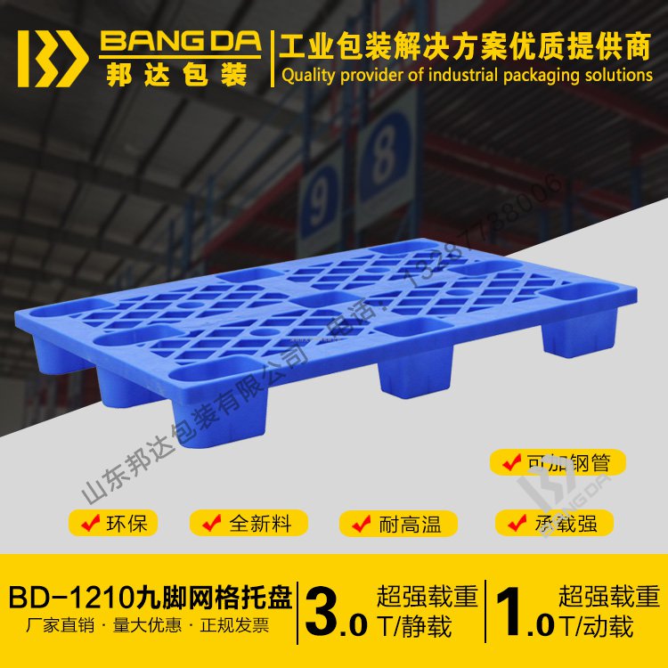 注:九腳網格托盤內部可加入鋼管,是為了達到增加承載的目的,延長托盤的使用壽命,塑料托盤如要在低溫環境中長期使用,要選擇全新料生產的產品。